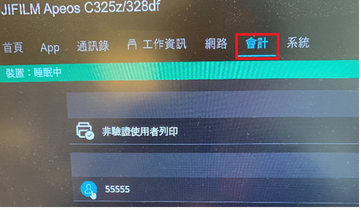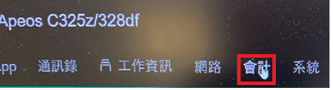 ※預設使用者名稱:11111、密碼:機器背面的序號(XJ碼-SER碼,共10碼) - 在CWIS左上角的選單中按 [會計]