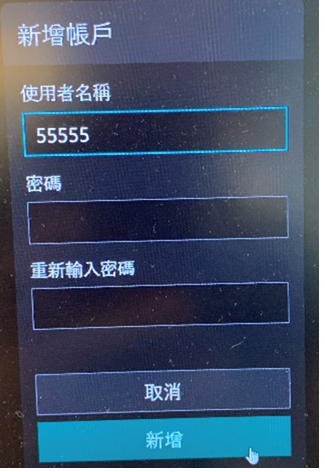 - 新增帳戶請自行定義使用者名稱和密碼,按新增