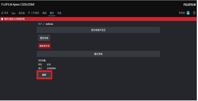 - 按[編輯] 設定限制列印黑白張數或彩色張數,無限制請輸入9,999,999