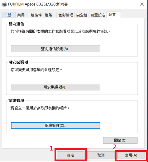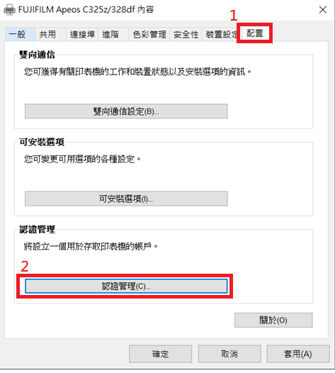 - 印表機內容 > 配置 > 認證管理